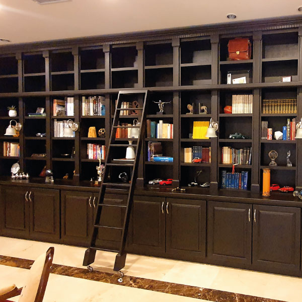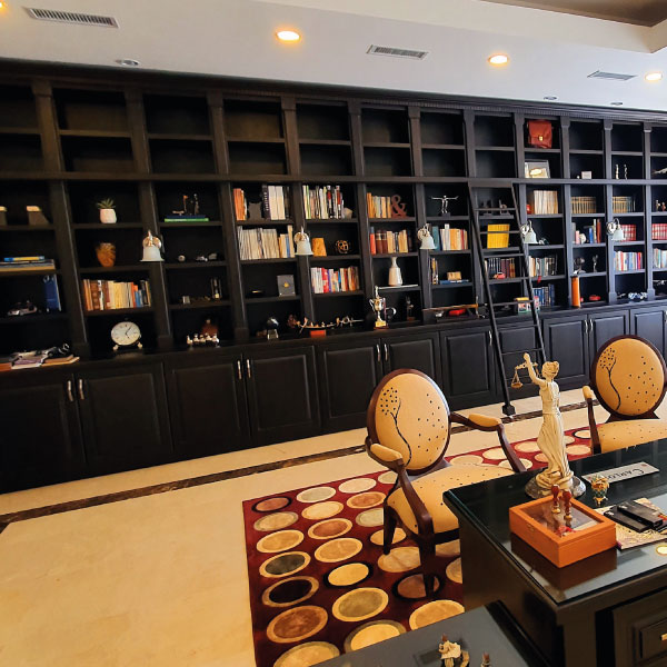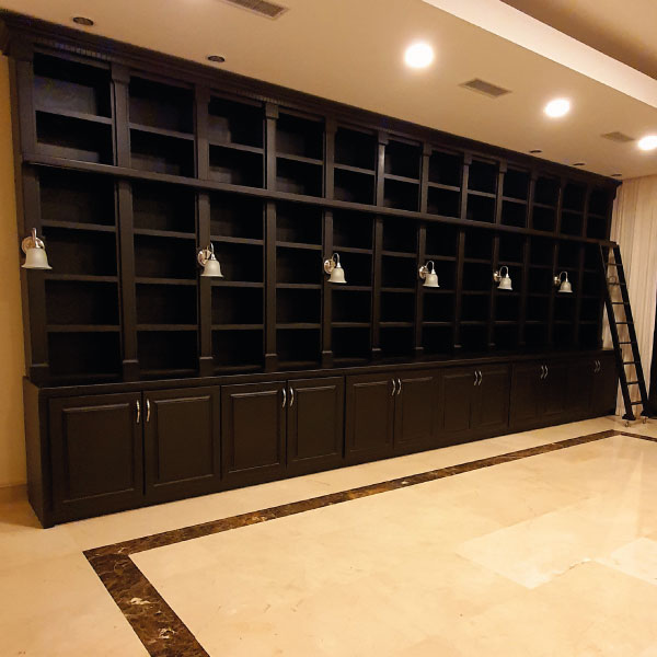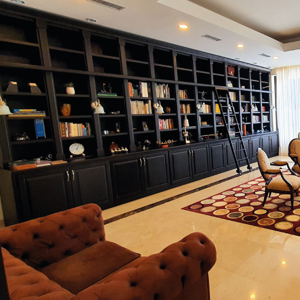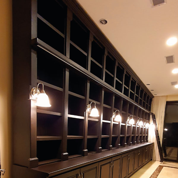 Biblioteca fabricada en madera cedro con detalles de iluminación.