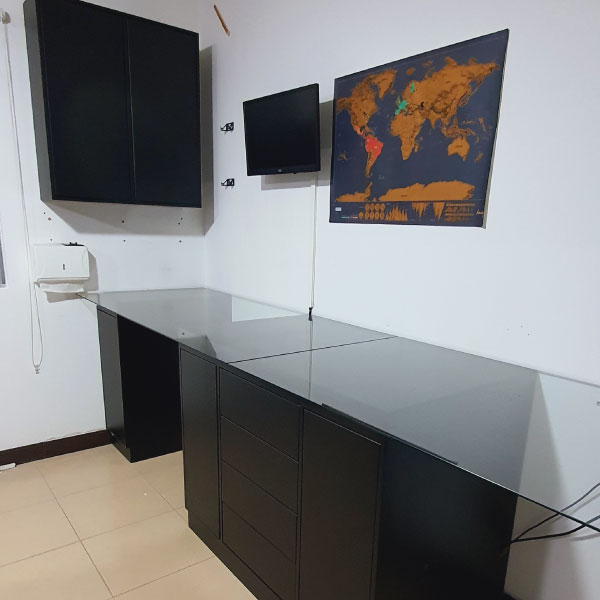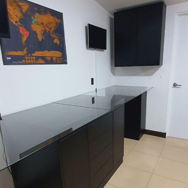 Escritorio fabricado en melamina hidrofuga y sobre en vidrio.